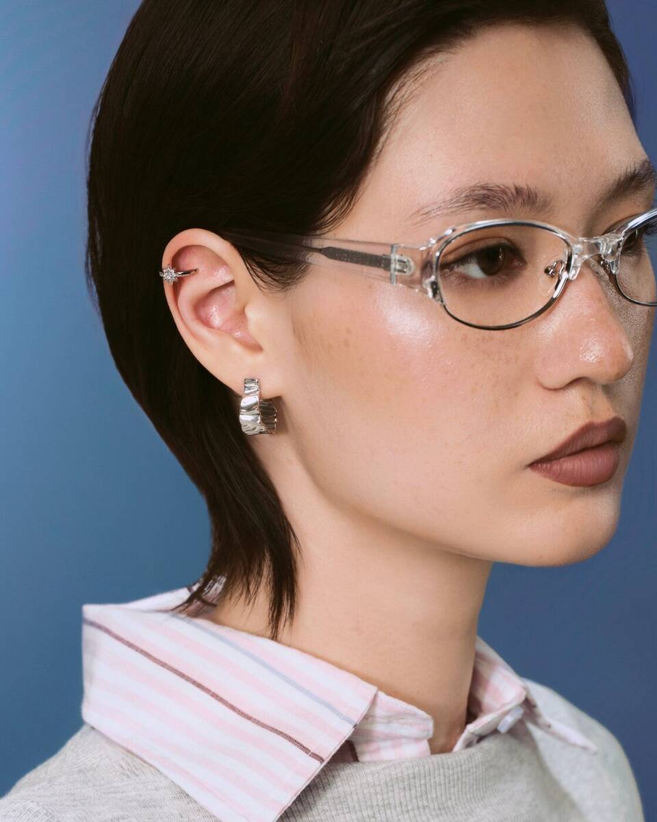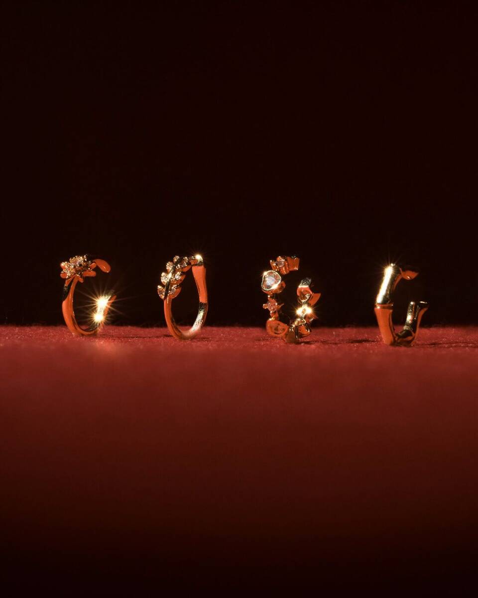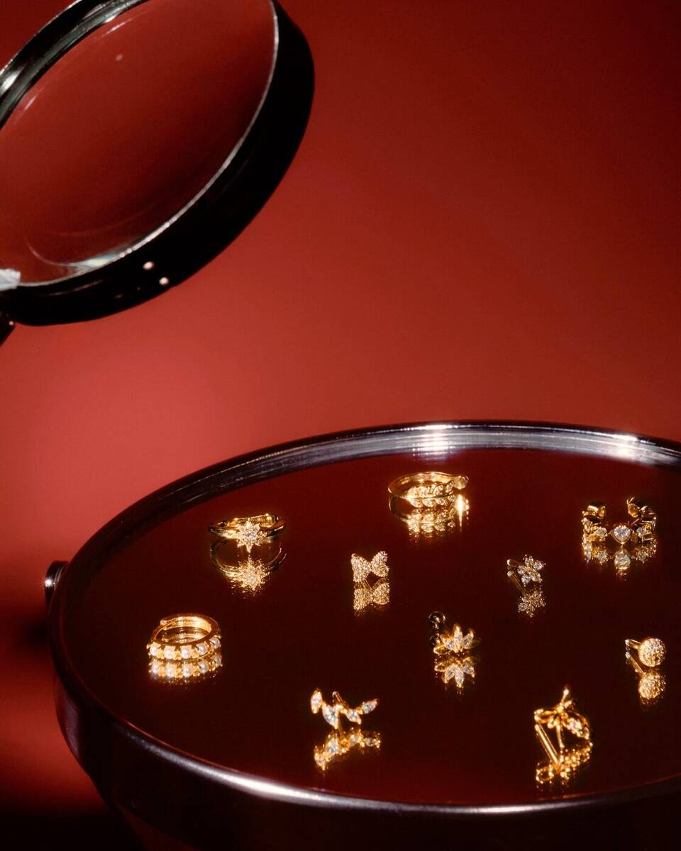 Ear piercing = 80%+ revenue. Nostril and navel are popular secondary positions. Editorial close-face format: natural skin, glowy makeup, jewelry as the focal point, hair away from ears.